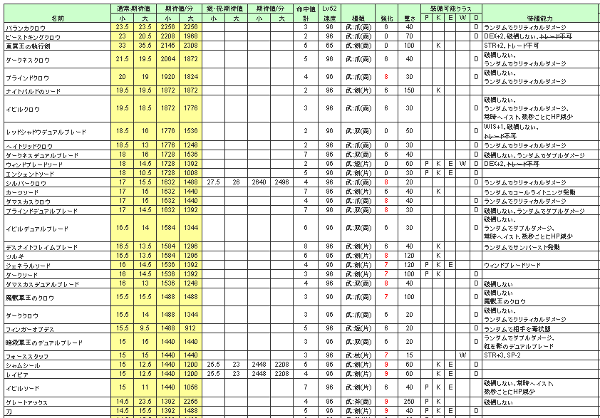 | シルバーロングソード | 13.5 | 15.5 | 1296 | 1488 | 24 | 26 | 2304 | 2496 |